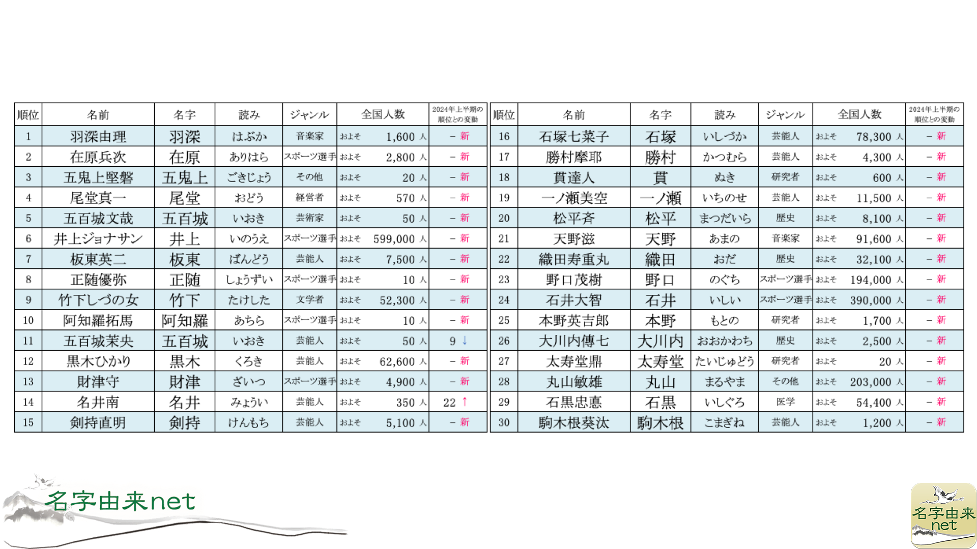 ※上記データは月間1,000万アクセスの「名字由来net」Web、「名字由来net」、「有名人一覧」アプリのデータベースから、当会の厳選なる審査を経て、アクセス数の多かった人物(有名人)を多い順に抽出、集計いたしました(集計期間:2024年12月1日~2025年5月31日。集計日:2025年6月24日。総検索数:3,061,988件)。「ジャンル」は6月24日時点で「名字由来net」に登録されているジャンル。今回調査で第624回目(前回は「2025年赤ちゃん名づけ上半期トレンドアクセスベスト100」を発表)。