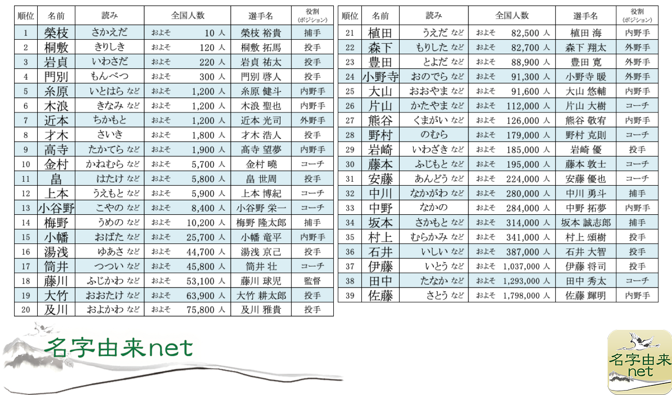 ※上記データは月間1,000万アクセスの「名字由来net」Web、アプリの名字データベースから、政府調査系機関や電話帳データをもとに、実世帯が確認できる名字のみを集計しました。阪神タイガースの出場選手登録メンバー(2025年9月7日(日)時点)、監督、一軍コーチを対象にし、外国人選手の2名は除外。全国人数は四捨五入で算出し、当社委員会の厳正な審査を経て全国人数の少ない順で抽出いたしました。「新字・旧字・異体字」に関しては、人数の登録が無いものは「新字」の人数を正とし集計しています。今回の調査で639回目(前回は「2025年秋の参拝におすすめ! 秋の神社・お寺トレンドアクセスランキングベスト15(全国版)」を発表)。