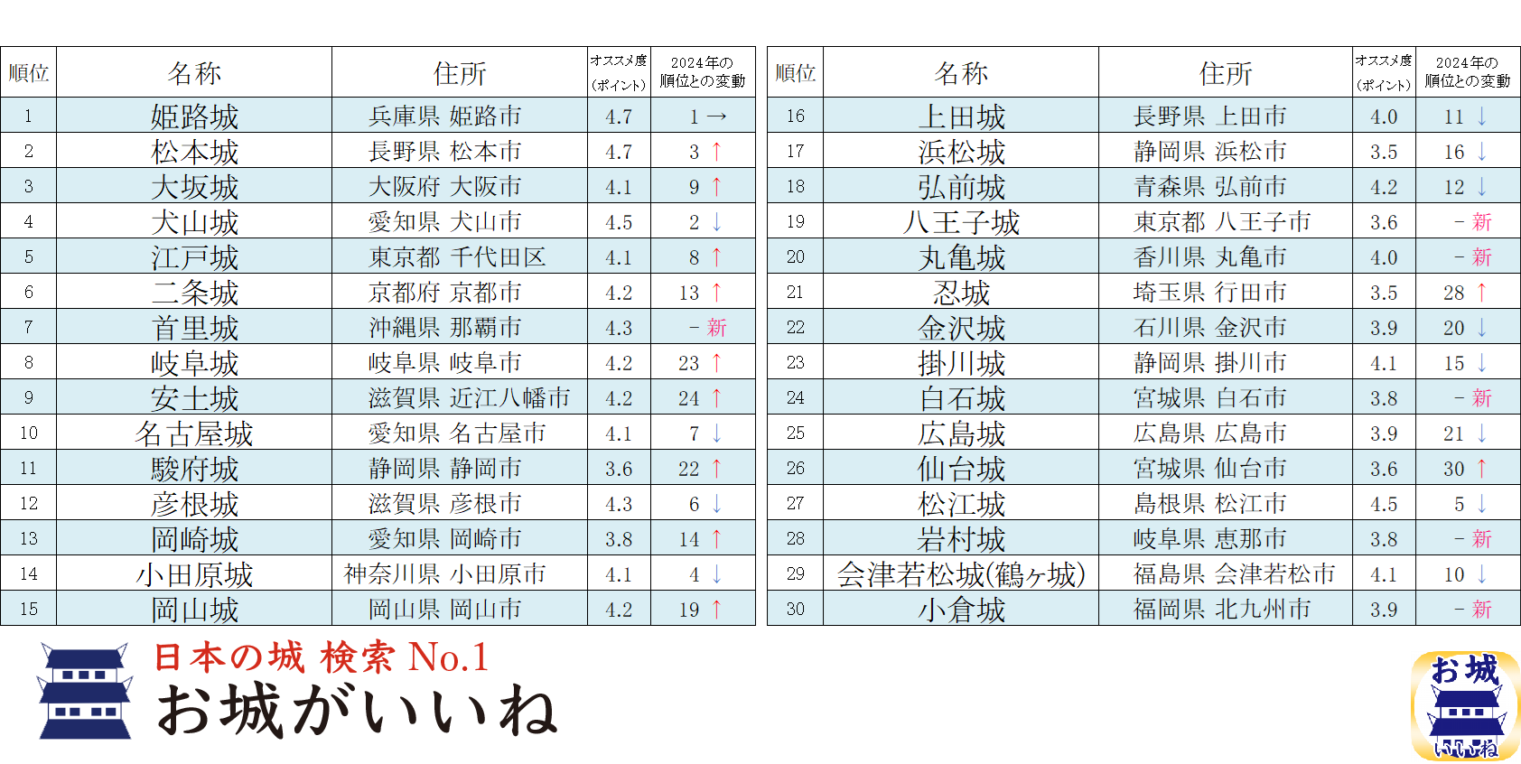 ※上記データ「お城がいいね」Web、アプリのデータベースから「オススメ度」が3.5以上のお城を抽出、検索数の多い順にお城を集計し、当会の厳正なる審査を経てランキングを作成いたしました。(集計期間:2024年9月1日~2024年11月30日。集計日:2025年10月15日。総検索数370,901件)。「オススメ度」はユーザーの評価ポイントの参考指標です。順位には影響しません。今回の調査で640回目(前回は「2025年セ・リーグ優勝 阪神タイガース選手の珍しいレア名字ランキング」を発表)。