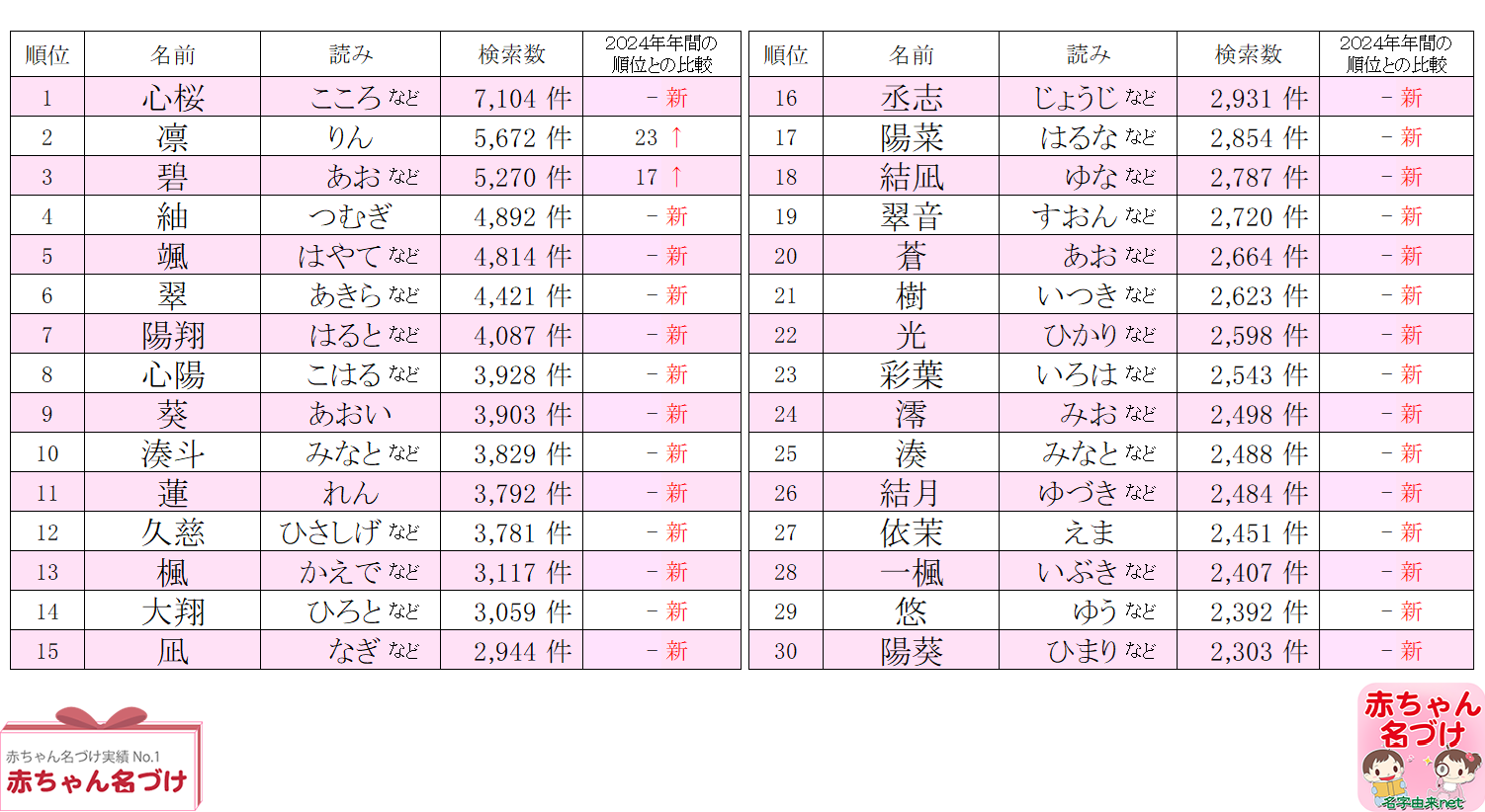 2025年赤ちゃん名づけ総合年間トレンドアクセスベスト100「2025年赤ちゃん名づけ総合年間トレンドアクセスベスト100」の第1位は「心桜(こころ)」ちゃんとなりました。今年6月発表の「2025年赤ちゃん名づけ上半期トレンドアクセスベスト100(https://namae-yurai.net/trendRanking.htm?rankingId=25)」でも第1位を獲得しており、その人気を維持し見事年間でも第1位に輝きました。第2位は「凛(りん)」ちゃん、第3位は「碧(あお)」くんがランクインしました。この2つの名前は、昨年の年間総合ランキングから引き続きベスト30入りした数少ない名前です。