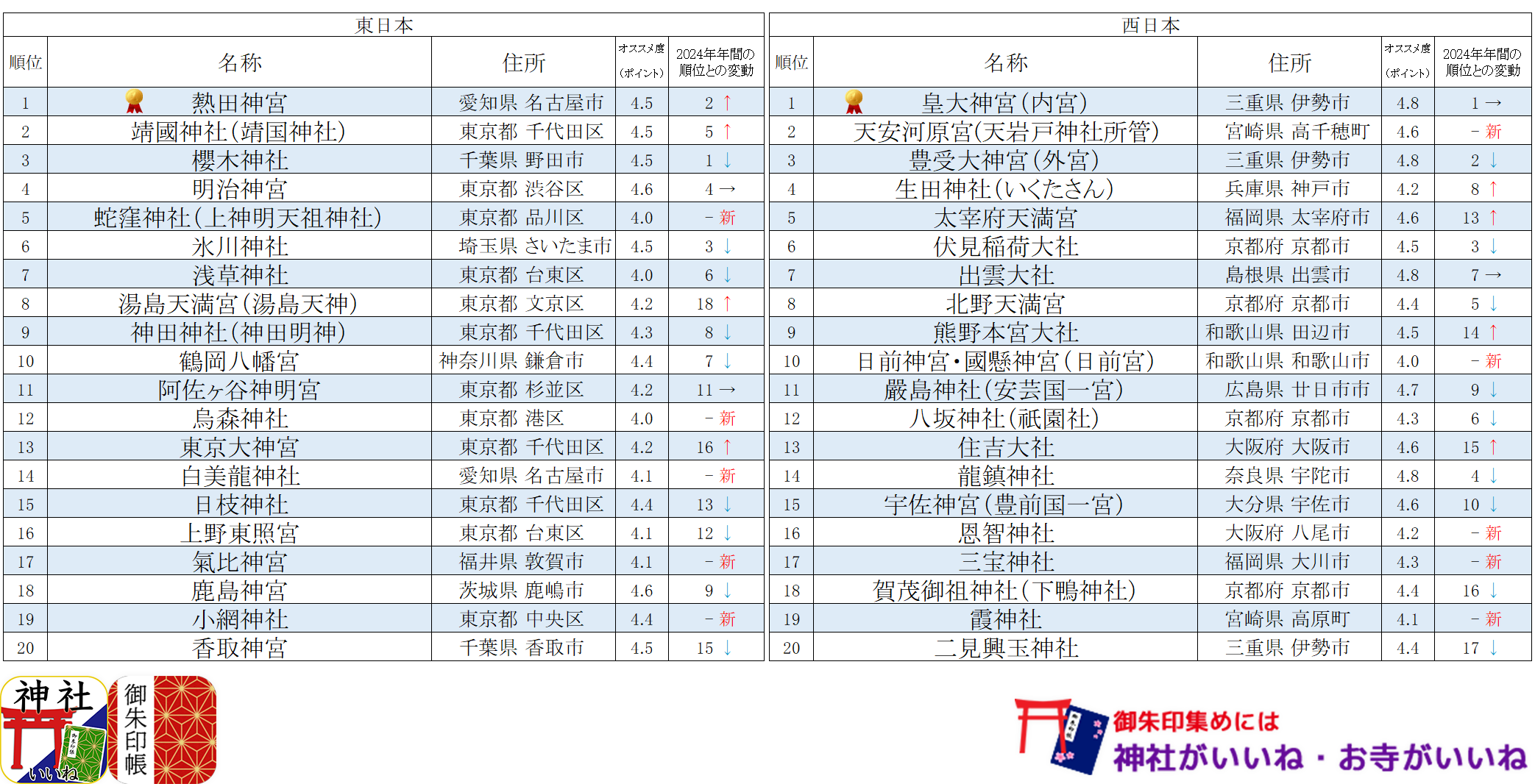 新規にランクインした神社は、東日本・西日本ともに5件ずつ(25%)の計10件でした。東日本第5位「蛇窪神社(へびくぼじんじゃ)」、西日本第19位「霞神社(かすみじんじゃ)」等、今年の干支「巳(蛇)」にまつわる神社が、上半期に引き続きランクインしています。その他、地元では「けいさん」の愛称で親しまれている「氣比神宮(けひじんぐう)」(東日本第17位)、総称して「日前宮(にちぜんぐう)」とも呼ばれ同一境内に座す二社からなる「日前神宮・国懸神宮(ひのくまじんぐう・くにかかすじんぐう)」(西日本第10位)といった神社が初ランクインしました。今年も残すところあと一ヶ月を切りました。来たる2026年の初詣に向け、新たな年の平穏と幸福を願いに足を運ぶ神社を「神社がいいね・お寺がいいね(Web・アプリ)」で探してみてはいかがでしょうか。ランキングの神社の詳細については、「神社がいいね・お寺がいいね(「東日本」https://jinja-bukkaku.net/ranking.htm?rankingKind=114、「西日本」https://jinja-bukkaku.net/ranking.htm?rankingKind=121)」をご覧ください。