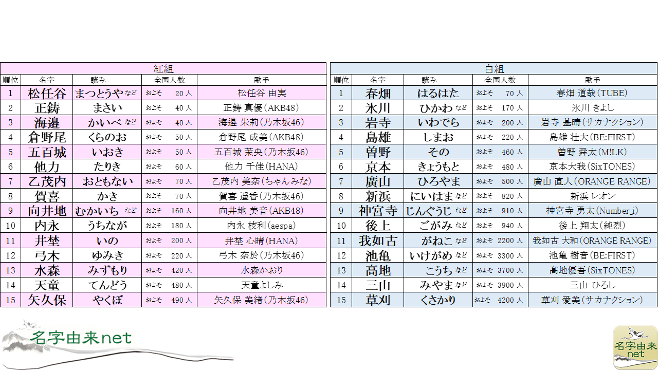 第76回NHK紅白歌合戦出場歌手 紅白珍しいレア名字ランキング