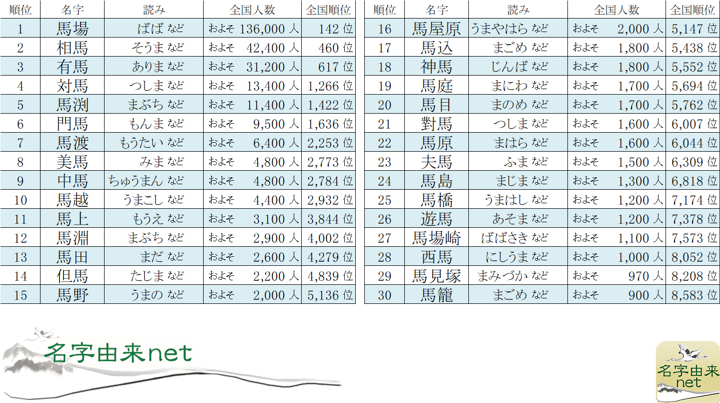 ※上記データは月間1,000万アクセスの「名字由来net」アプリと「名字由来net(Web)」の名字データベースから、政府調査系機関や電話帳データをもとに、「午」「馬」のつく名字から実世帯の確認できる名字のみを集計いたしました。全国人数の多い順に抽出し、全国人数は四捨五入で算出、当社委員会の厳正な審査を経てランキングを作成いたしました。今回調査で第650回目(前回は「第76回NHK紅白歌合戦出場歌手 紅白珍しいレア名字ランキング」を発表)。
