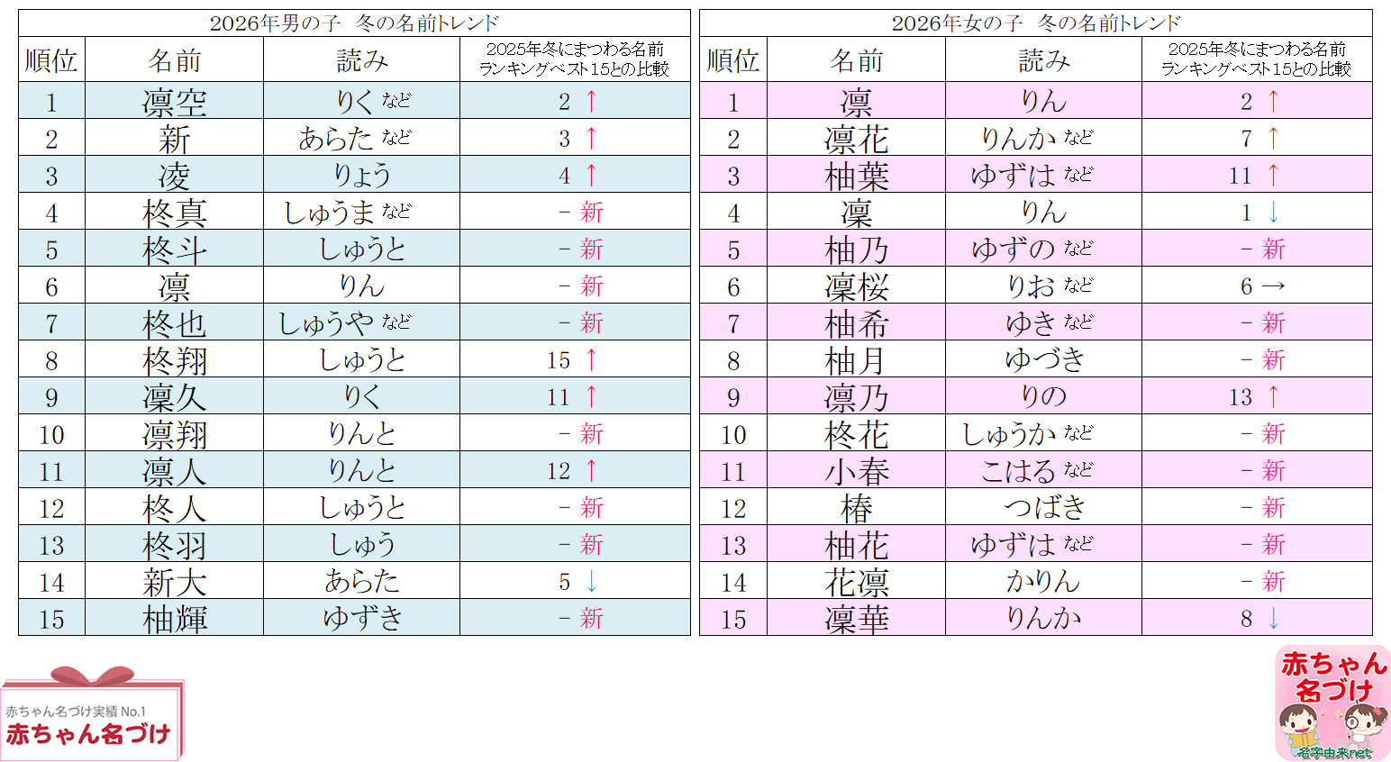 2026年男女別 冬にまつわる名前ランキングベスト15「2026年男女別 冬にまつわる名前ランキングベスト15」の男の子第1位は、昨年から1つ順位をあげた「凛空(りく)」くんでした。2024年以来2年ぶり4回目の第1位となります。第2位に「新(あらた)」くん。「新春」「新年」等、年の始まりを連想させる名前です。「みんなの名づけ」において、「常に先進的な考えと行動ができる人間になってほしい」という声がみられました。第3位には「凌(りょう)」くん。「凌」には「しのぐ・こえる」といった意味があり、「真冬の寒さを凌ぐ」力強さを感じさせます。同名の有名人には俳優の「成田 凌(なりた りょう)」さん、「松田 凌(まつだ りょう)」さん等の方がいらっしゃいます。第6位に「凛(りん)」くんがランクイン。女の子のランキングで常に上位に位置する人気の名前が、今回初めて男の子のランキングにランクインしました。