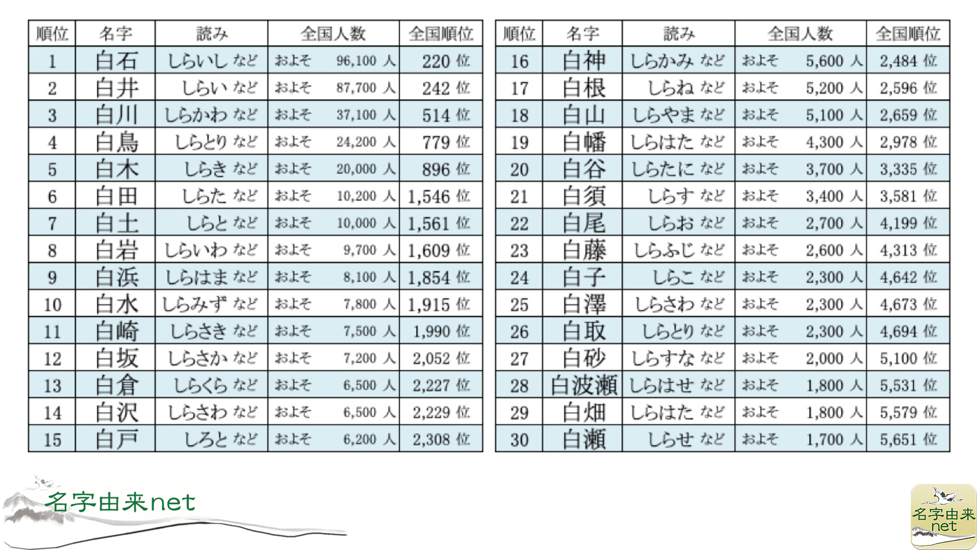 ※上記データは月間1,000万アクセスの「名字由来net」アプリと「名字由来net(Web)」の名字データベースから政府調査系機関や電話帳データをもとに、実世帯が確認できる名字のみを集計しました。「白」の字を含む名字を対象とし当会の厳正なる審査を経て、全国人数が多い順に算出。全国人数は四捨五入で算出し、集計いたしました。今回調査で第653回目(前回は「2026年男女別 冬にまつわる名前ランキングベスト15」を発表)。