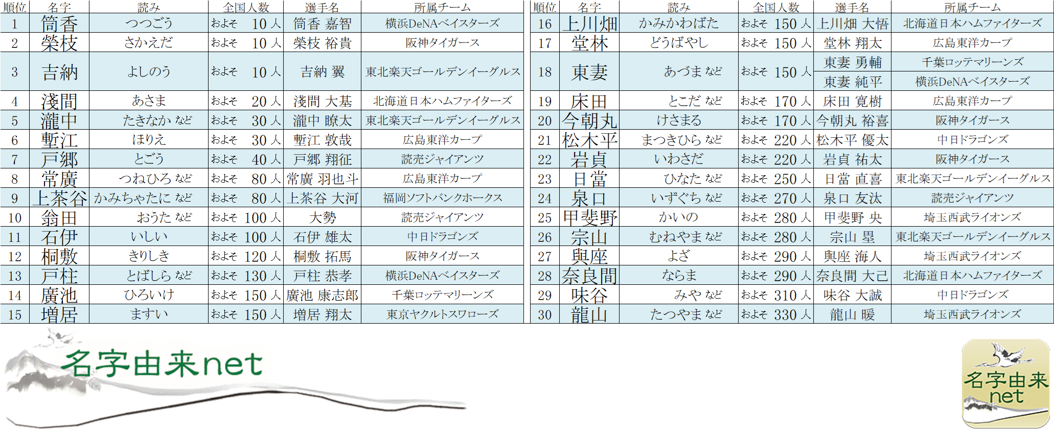 「2026年プロ野球選手の珍しいレア名字ランキングベスト30」を発表